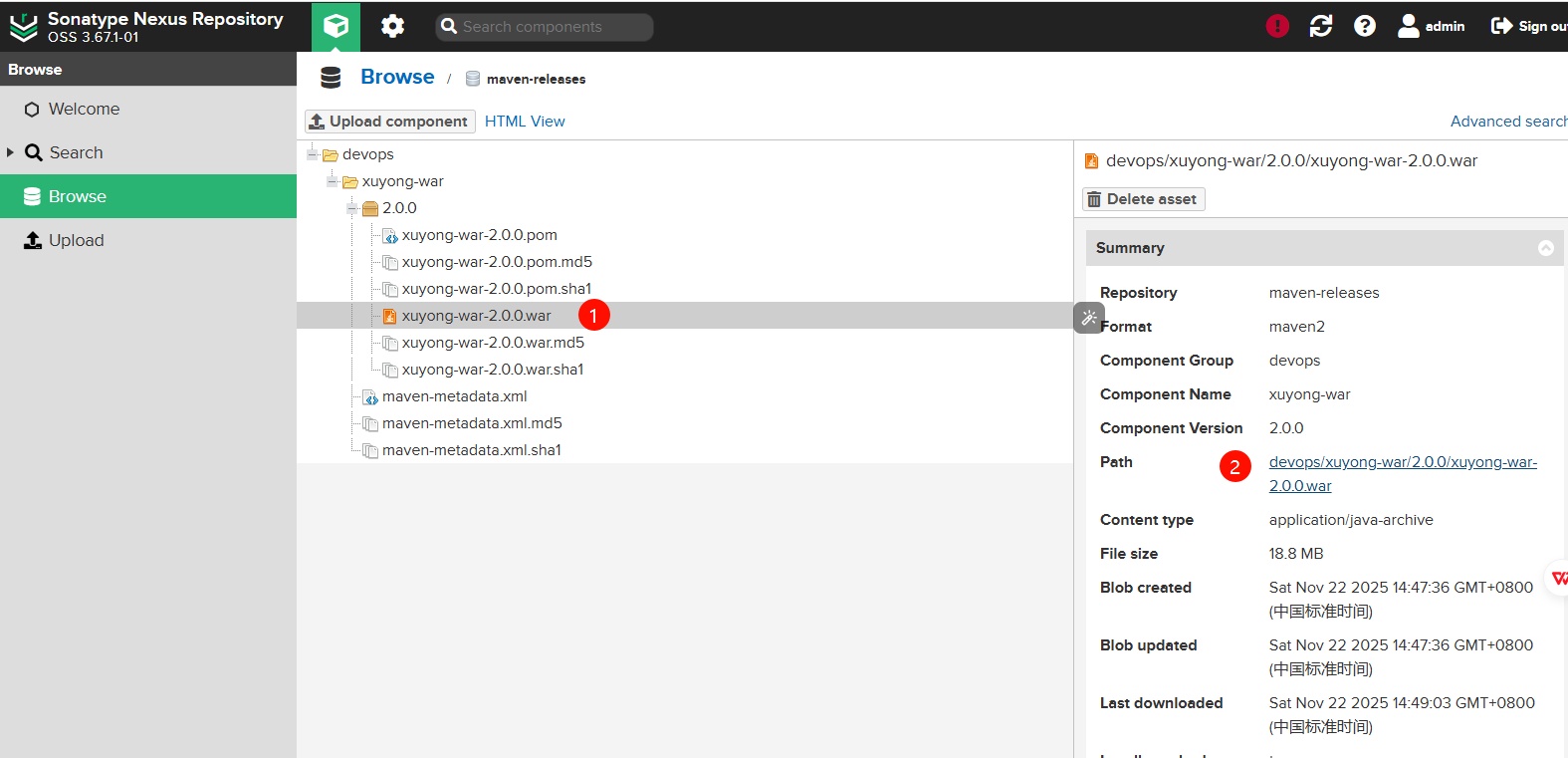 curl -s -uadmin:talent "http://nexus.hmallleasing.com/service/rest/v1/search?repository=maven-releases&maven.groupId=devops&maven.artifactId=oldxu-jar&maven.extension=jar" | grep downloadUrl | grep 'jar\",' | tail -1 | awk -F '"' '{print $4}';