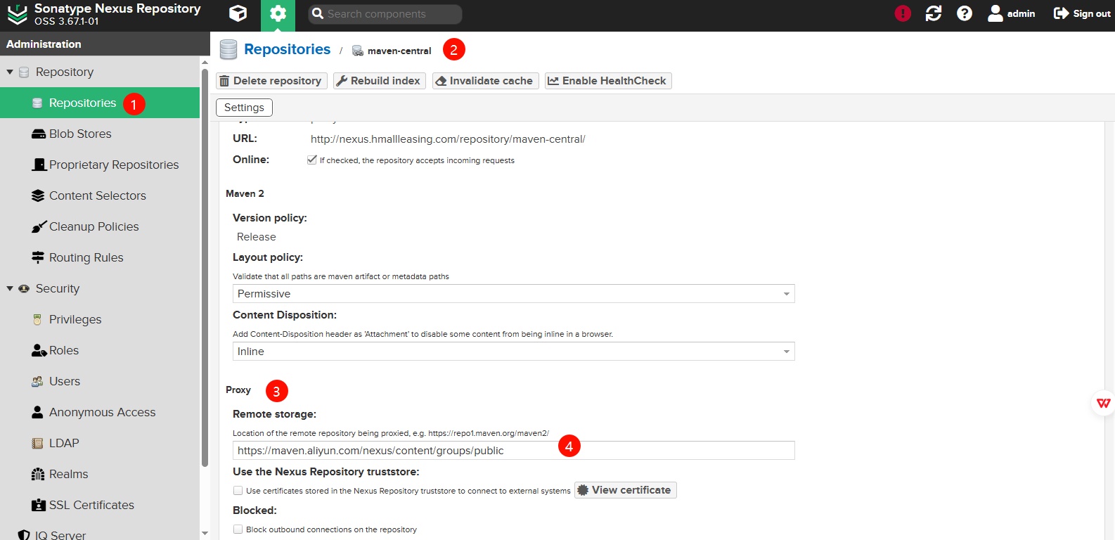 - 2、修改 proxy--> Remote storage 为 https://maven.aliyun.com/nexus/content/groups/public