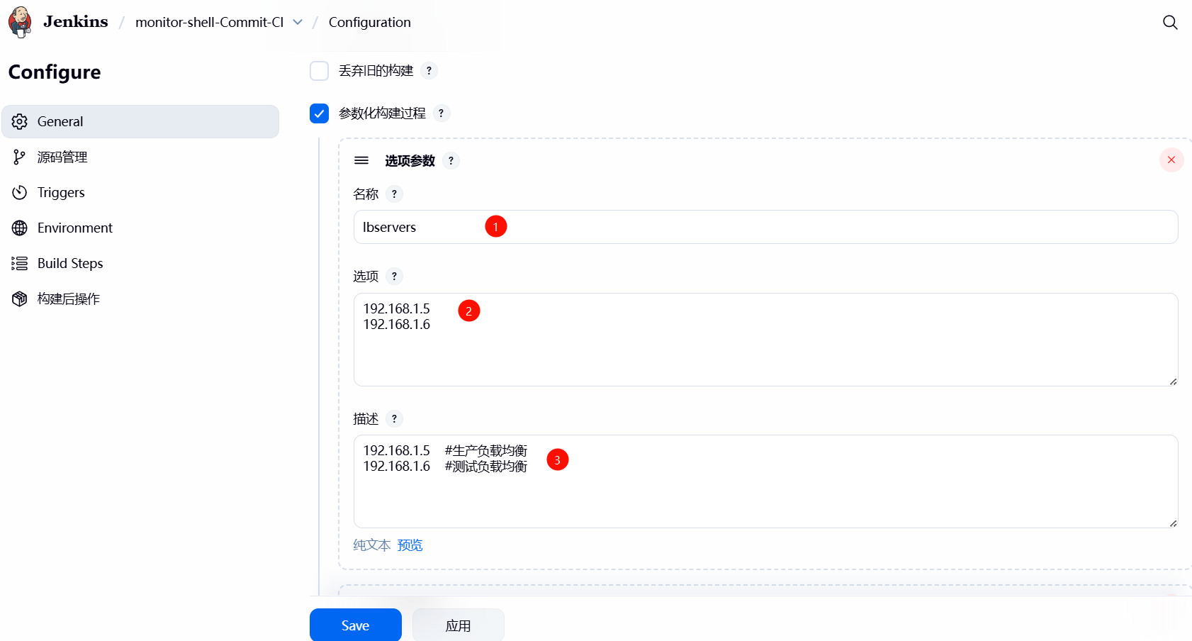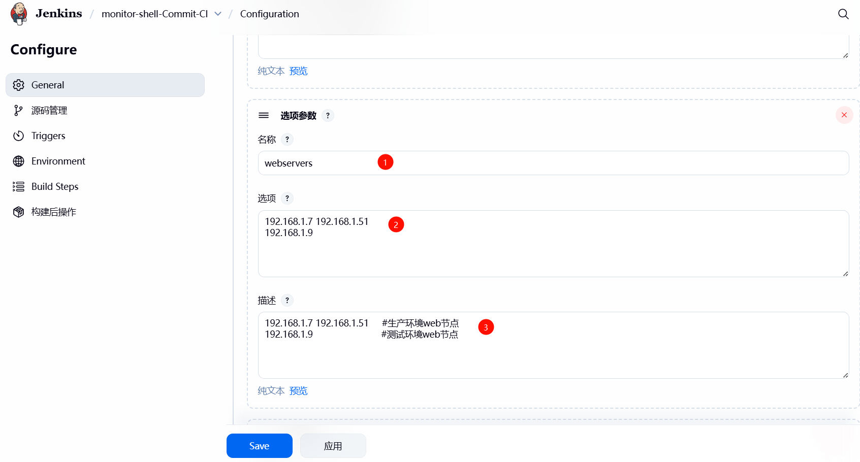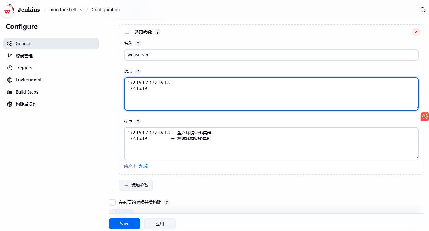1、在 Shell 脚本中,使⽤到了 webservers、lbservers 、git_commit_id 三个变量,需要通过 jenkins 选项参数,进⾏动态传参;