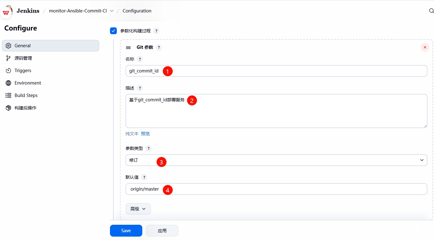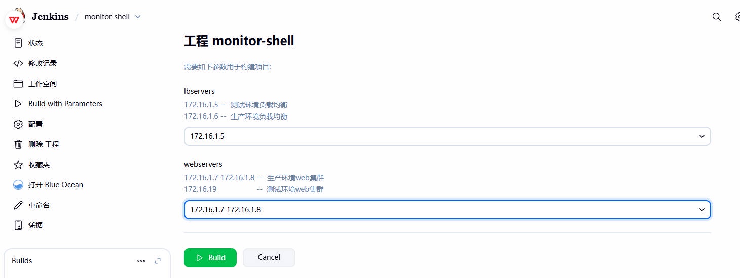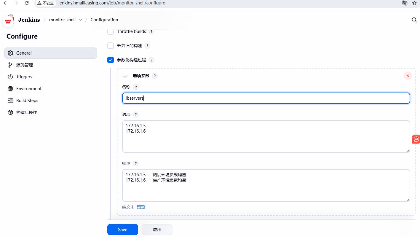 1、在 Shell 脚本中,使⽤到了 webservers、lbservers 、git_commit_id 三个变量,需要通过 jenkins 选项参数,进⾏动态传参;