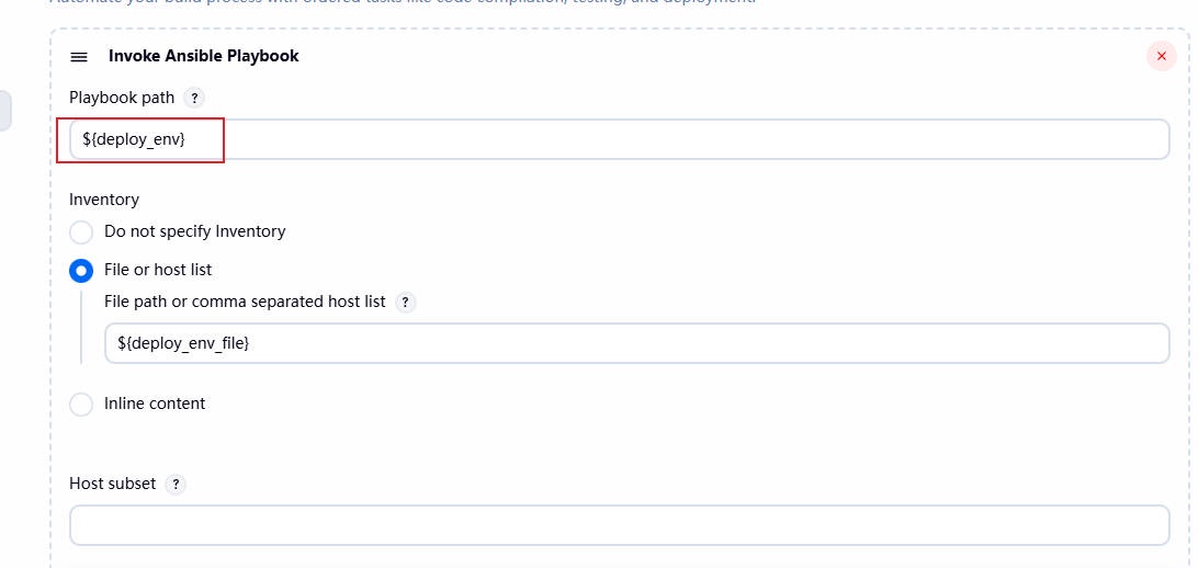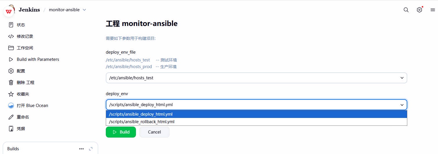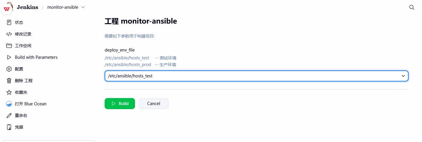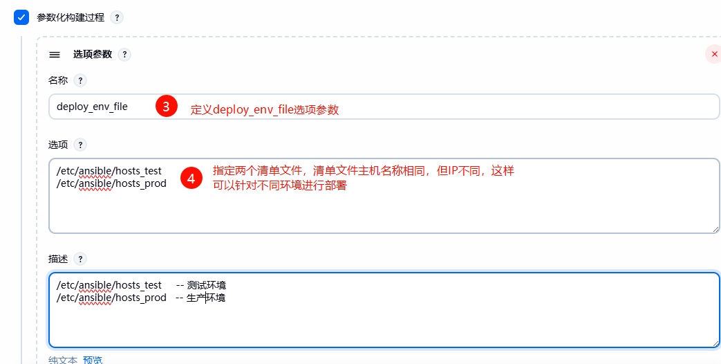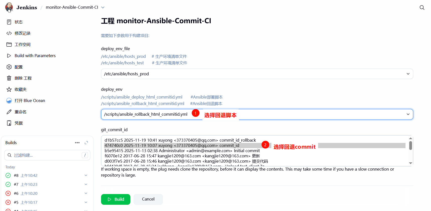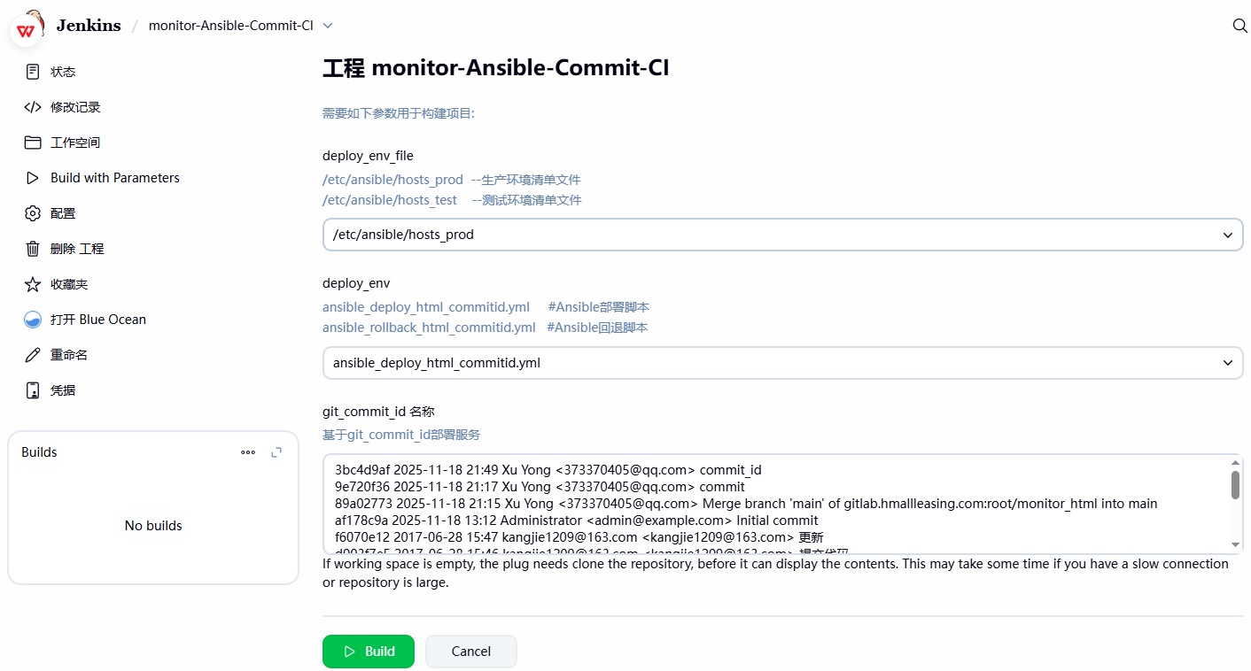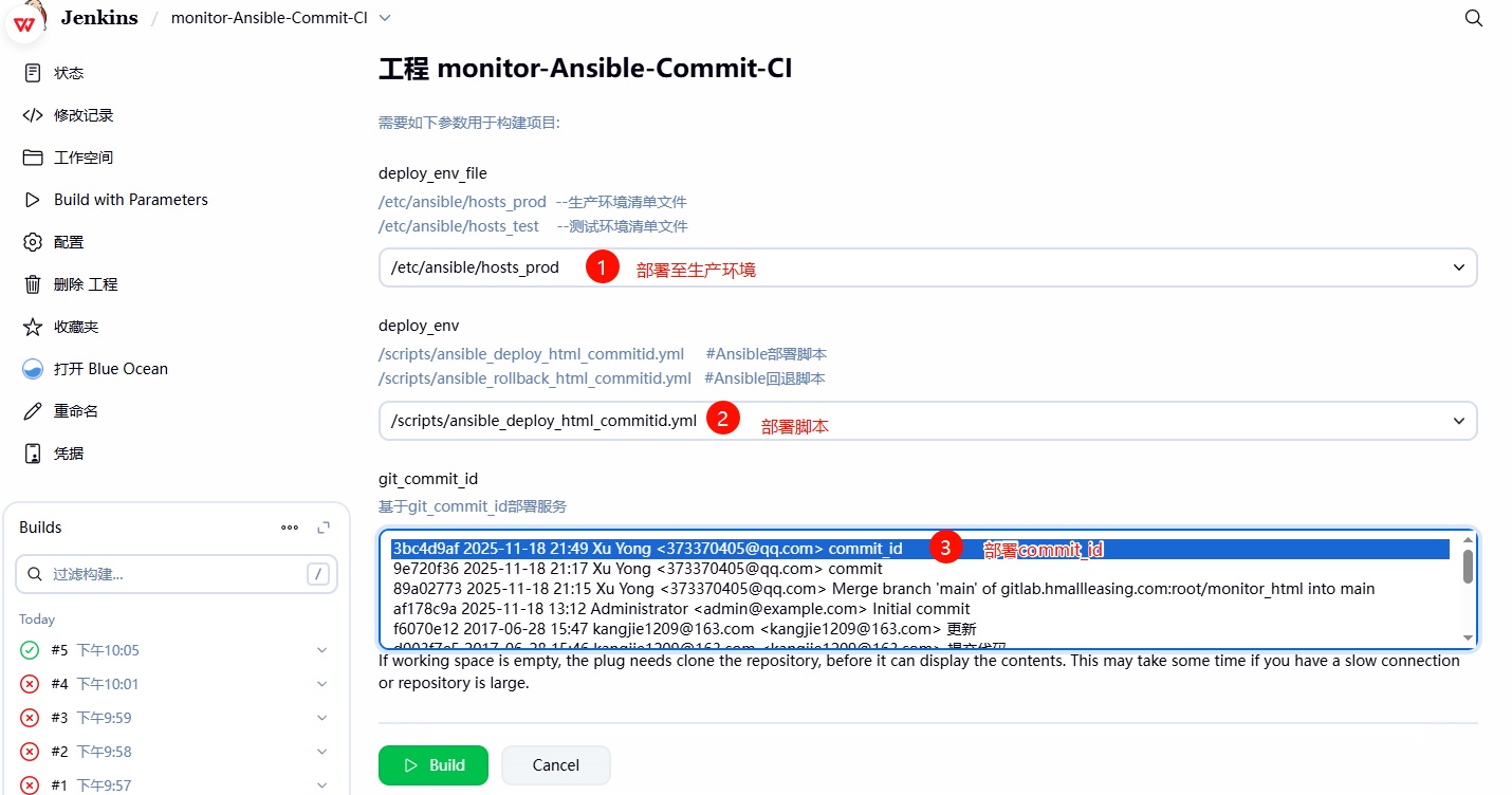 2、登陆 Jenkins,选择部署的 Ansible 清单⽂件(记得修改⼀下部署脚本的路径),然后选择部署的环境,最后选择开发提交的那个 3bc4d9af commit_ID 进⾏部署