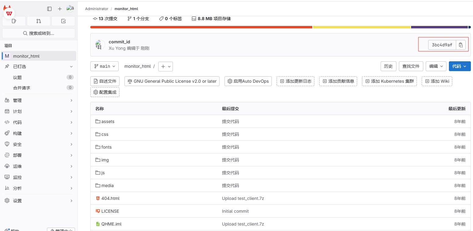 1、模拟开发提交代码⾄ Gitlab 服务器(最新的 CommitID 为 3bc4d9af );