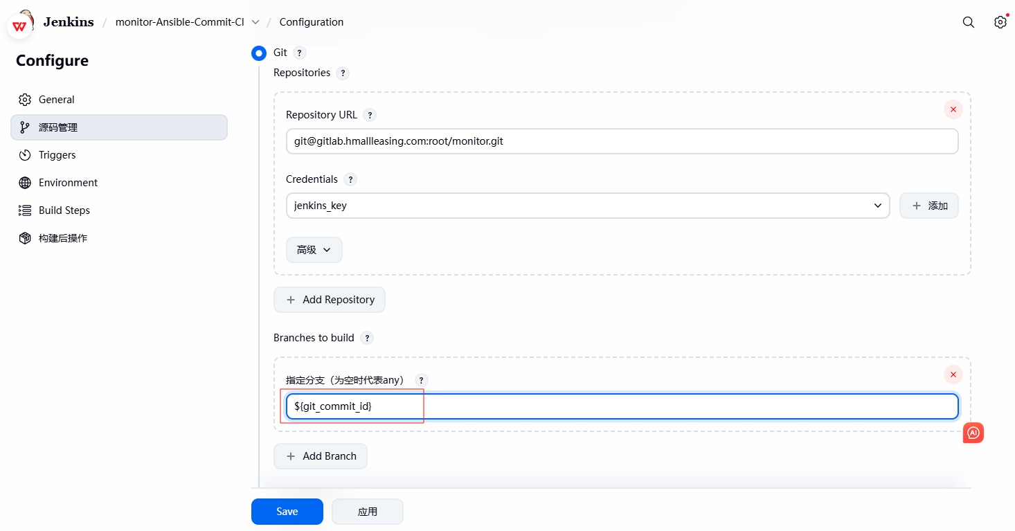 2. 修改源码管理,将默认拉取 main 分⽀最新代码,替换为 ${git_commit_id} 变量获取指定的代码;