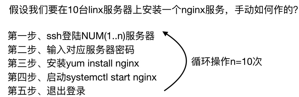 - 容易学习:无代理,不像 salt 既要学客户端与服务端,还需要学习客户端与服务端中间通讯协议;